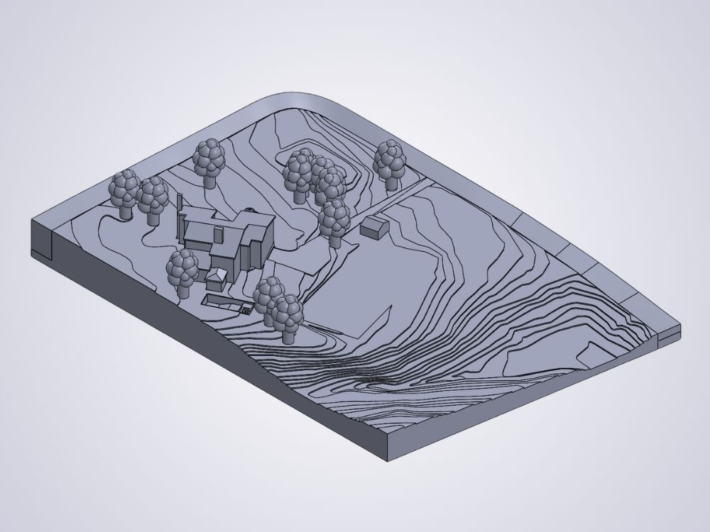 Topographic terrain converted into a detailed 3D CAD model using contour elevation data.