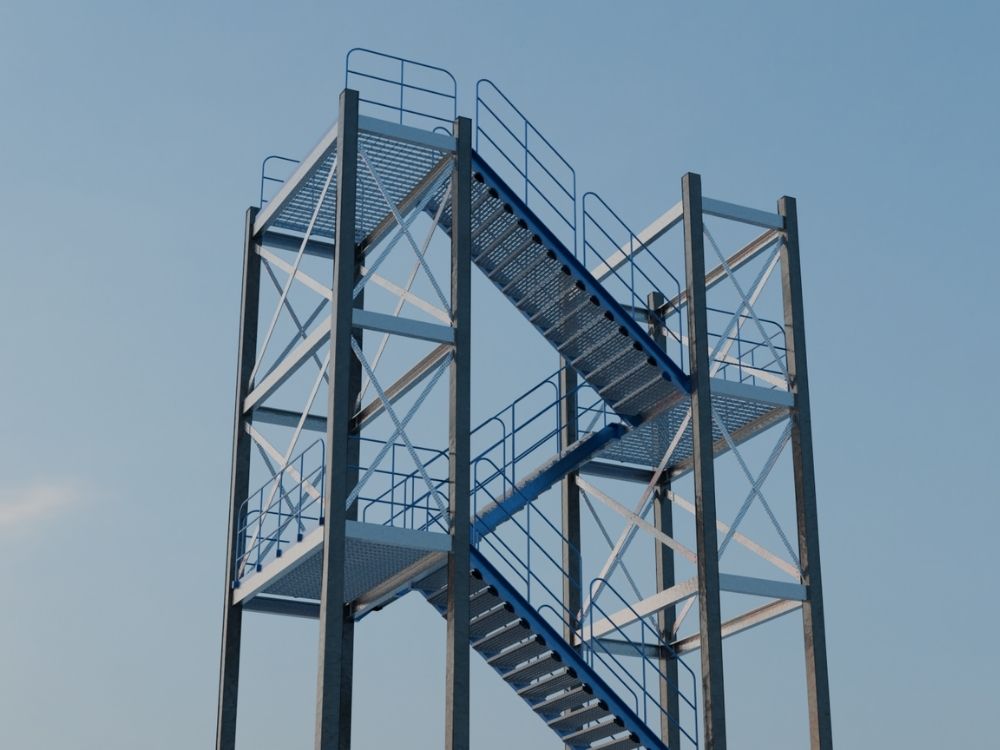 Industrial staircase was designed using sheet metal and weldment features in SolidWorks for fabrication-ready structural assembly.