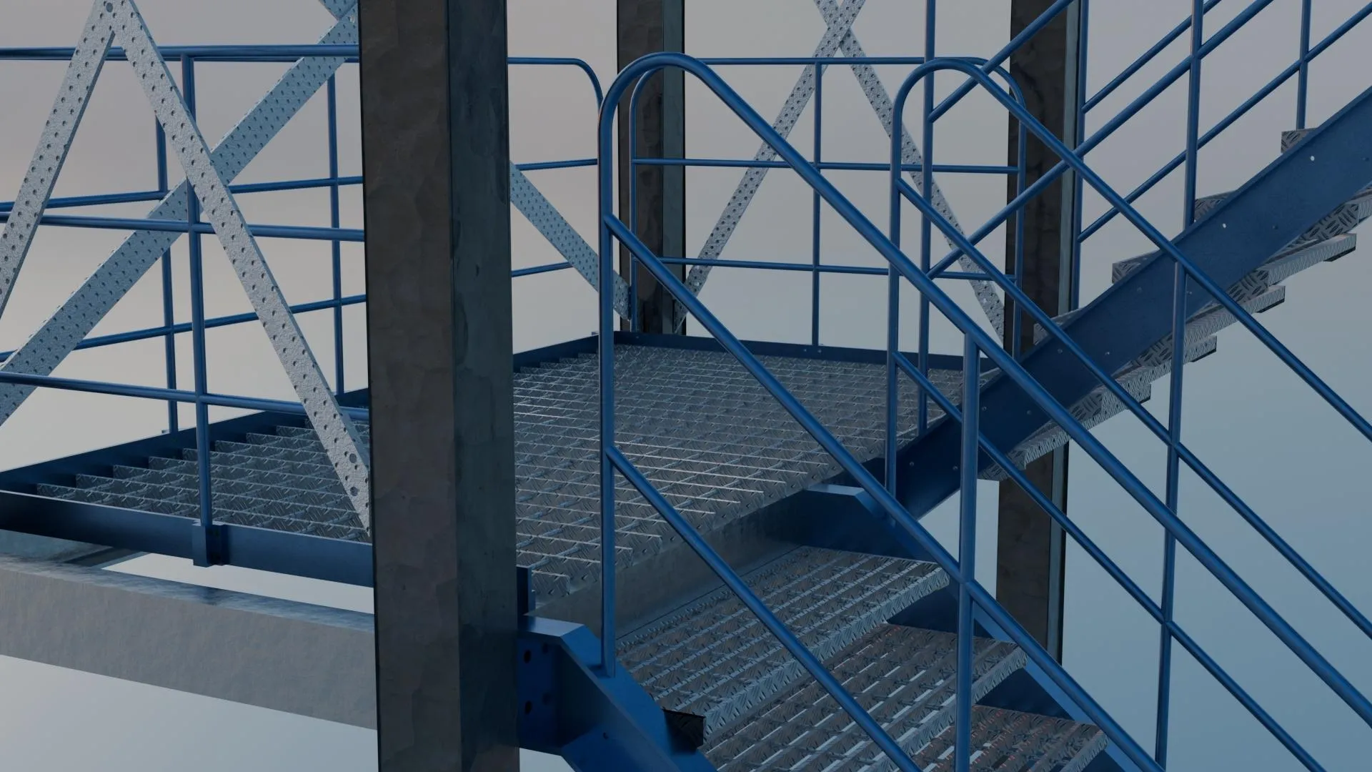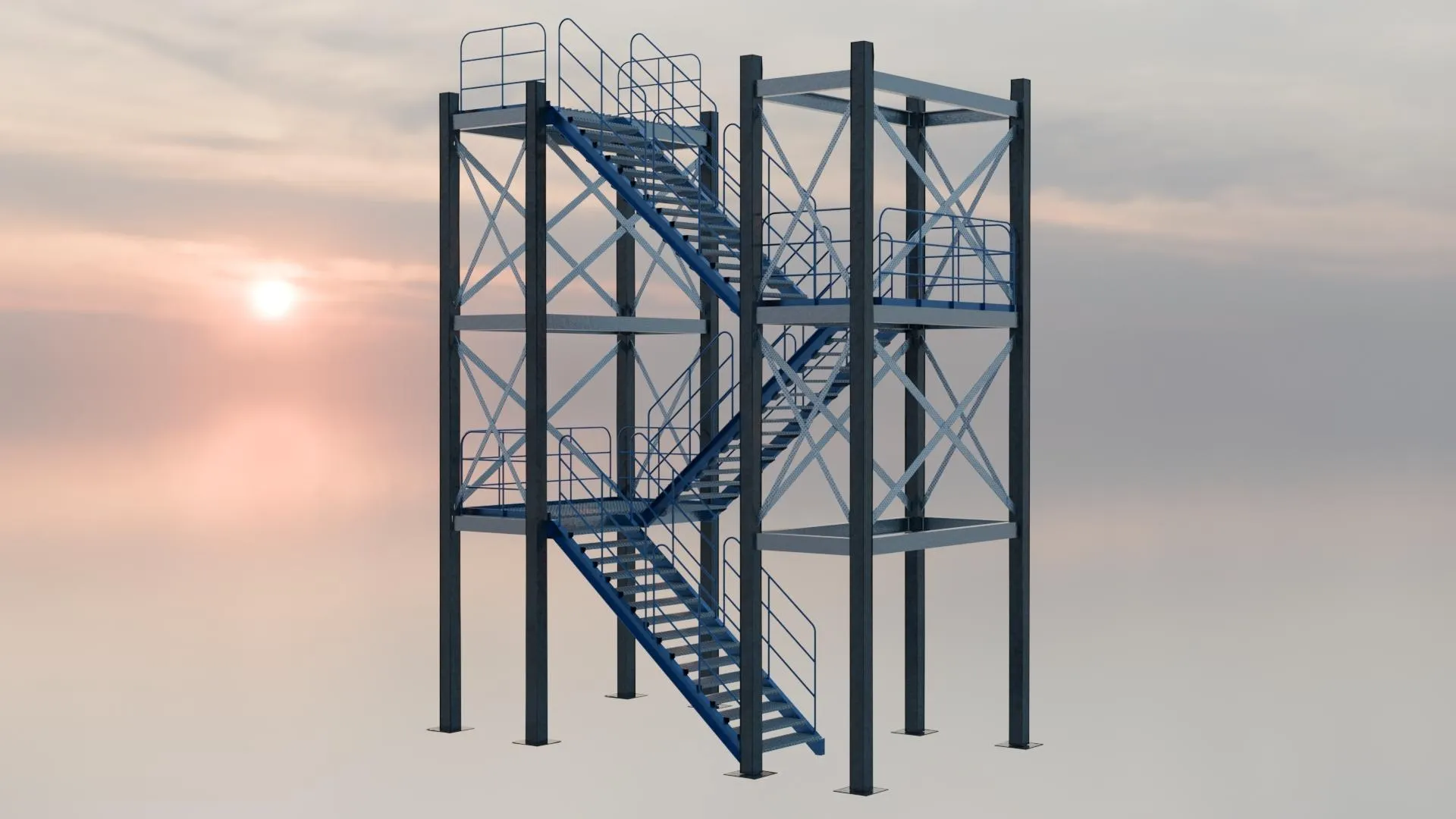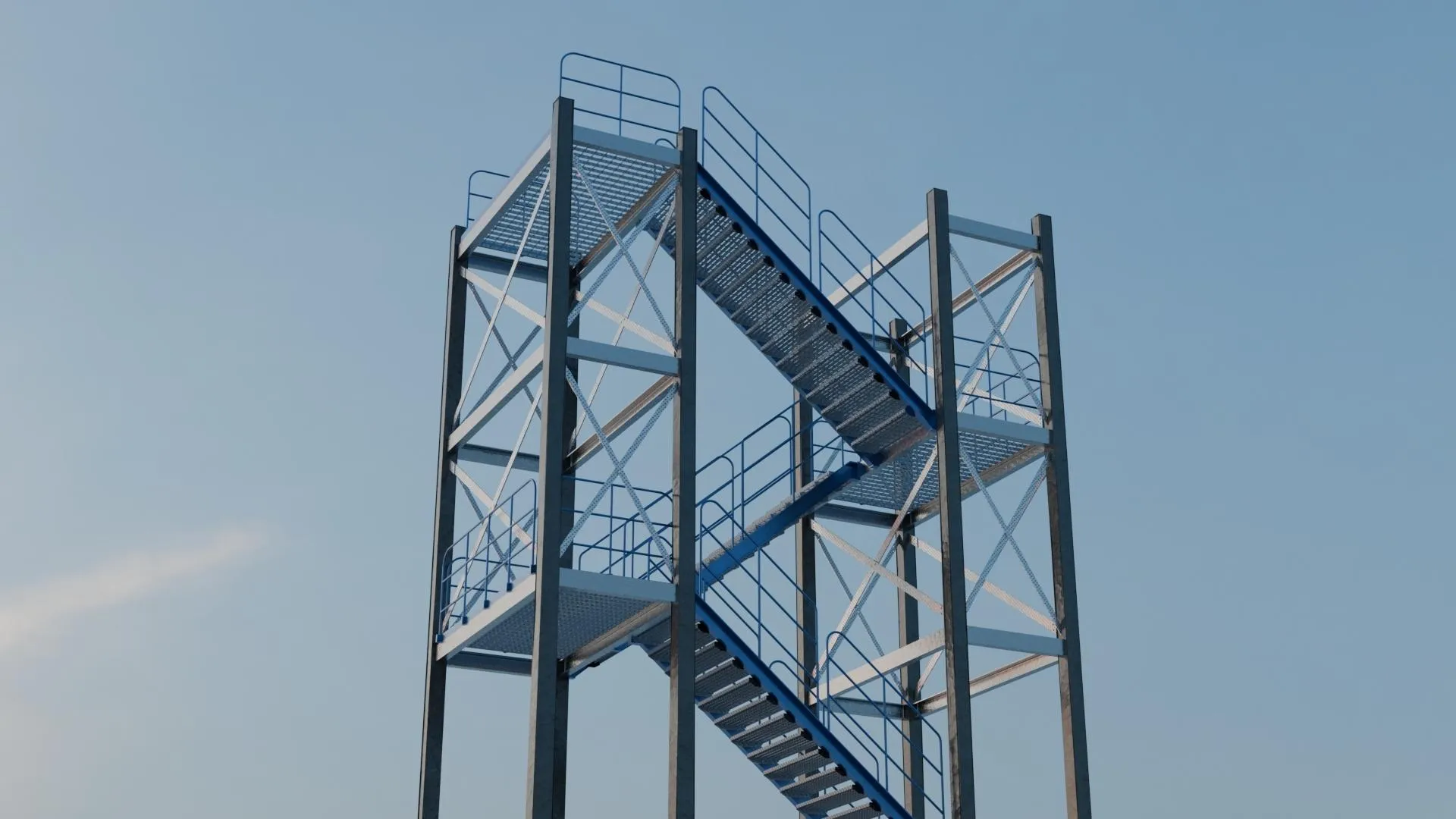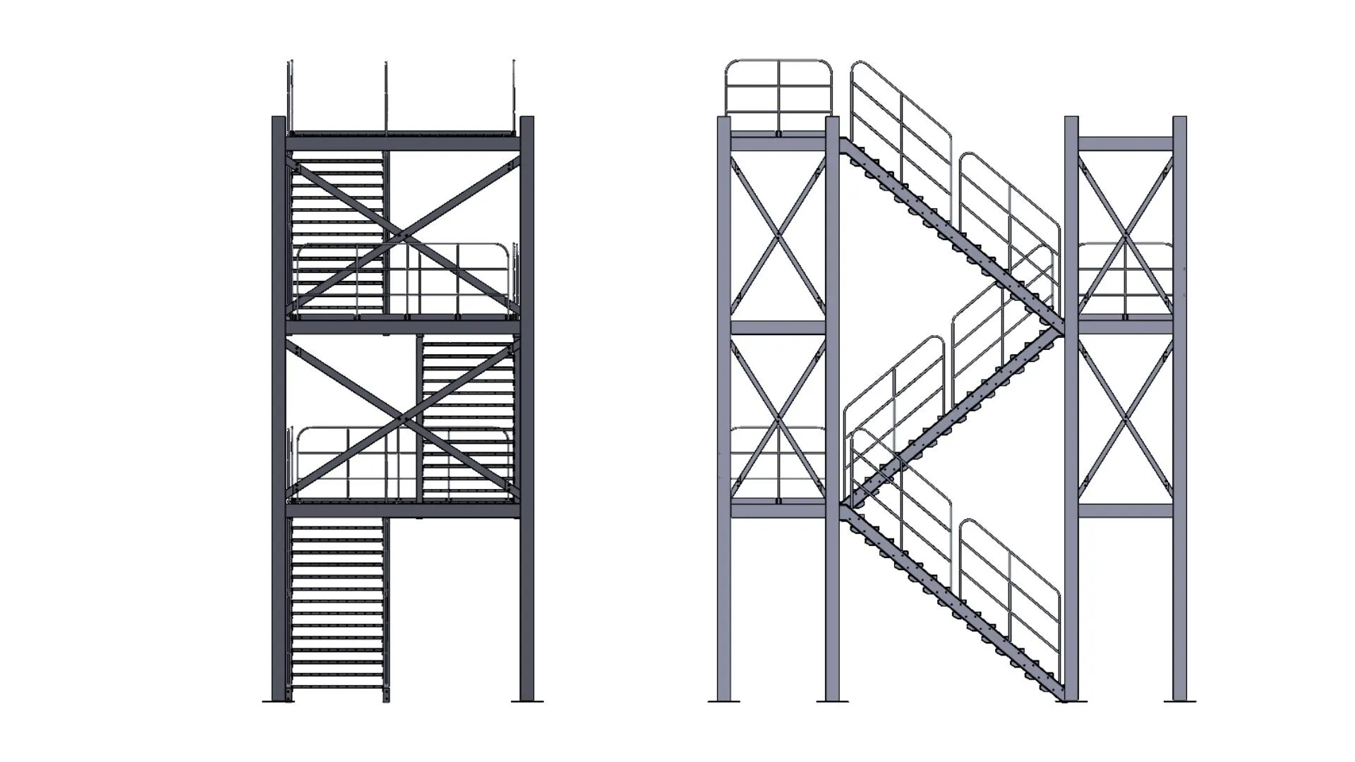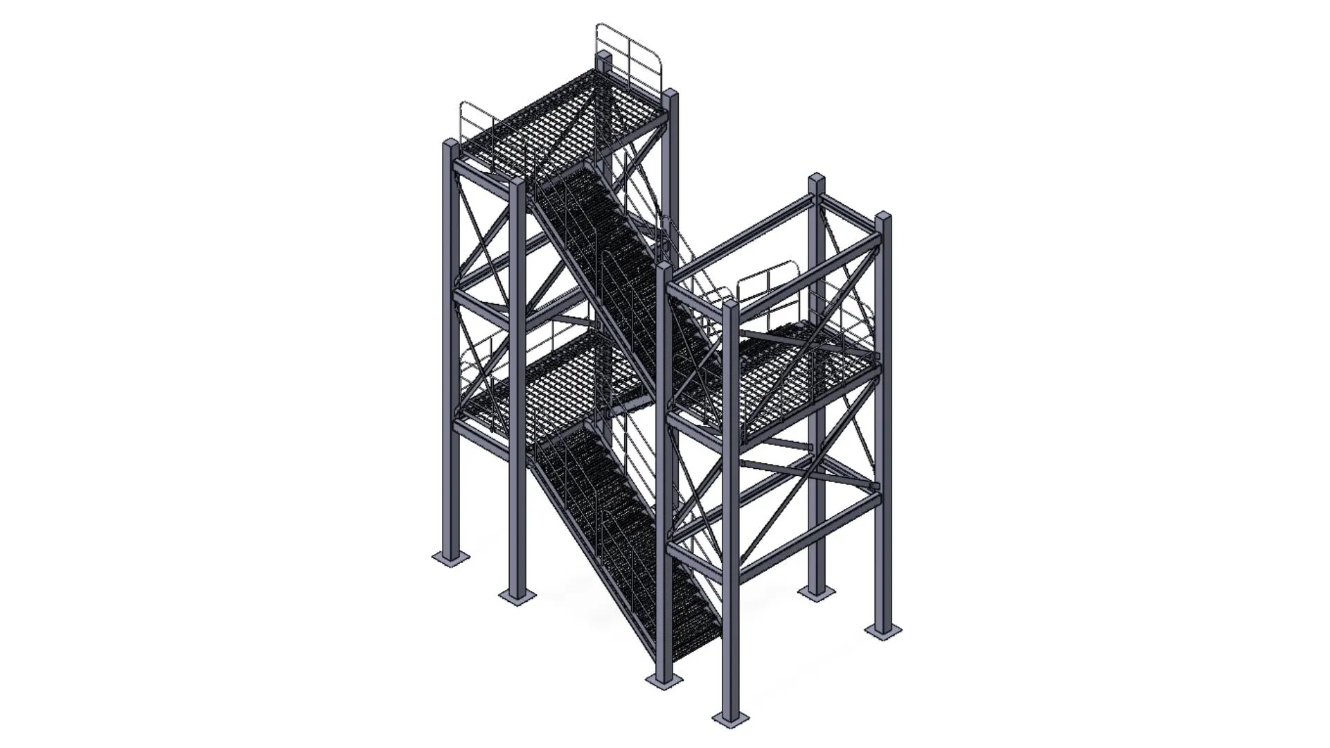 Standard proportions for tread, rise, and railing geometry were applied to ensure usability and compliance with typical industrial practices.